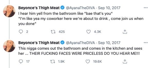 Twitter user AyanaTheDiva (third party link (3PL))* caught her boyfriend carrying on an affair with her a coworker at her new job. They started talking about boyfriends so the coworker goes to Insta and, well, you can read the rest.