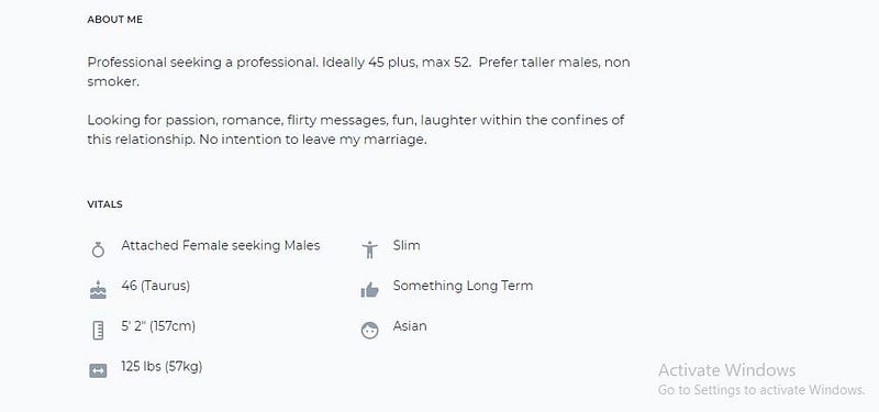 I also think it’s important to add warmth to his profile. Telling women that he’s interested in intimacy is vital because many cheaters miss that in their lives. That’s what I was missing when I first went looking.