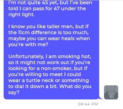 The height is good because she didn’t specify, so try — I know you like taller men, but if the 11cm difference is too much, maybe you can wear heels when you’re with me?