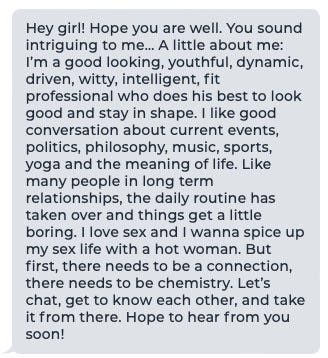 - The rest of the message is about him — loves sex, spice it up, life’s boring, conversationalist yada, yada, yada.