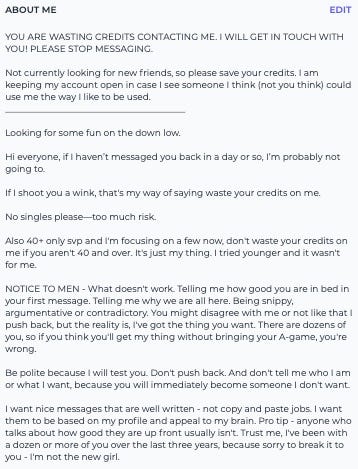 I’m not seeing is anything about me. There’s not one reference to my profile, and that’s key. My profile is a whopper so I know if they read and understood it. I suspected he hadn’t read it because my profile clearly says: