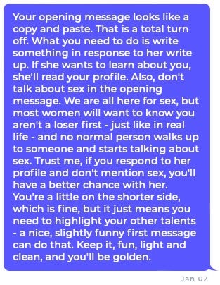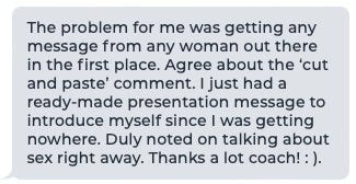 Most of the women I’ve corresponded with tell me they ignore copy pasta.