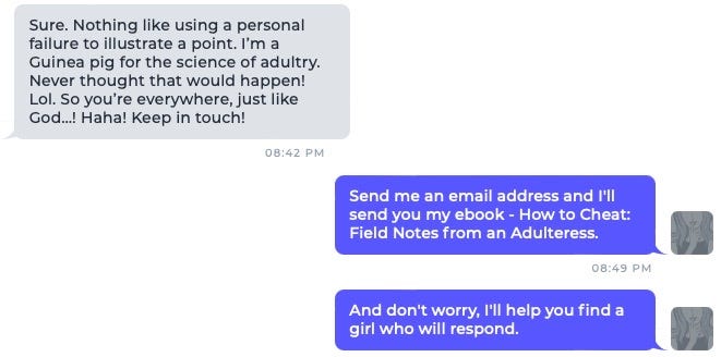 Here’s what I replied with, because your Faery Godmother of Adultery🧚🏻♀️ is ethically obliged to support all adulterers, no matter how misguided they might be starting out —