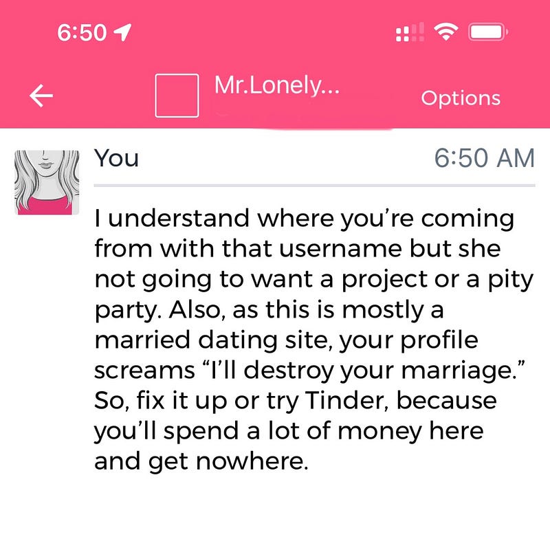 I understand where you’re coming from with that username but she is not going to want a project or a pity party. Also, as this is mostly a married dating site, your profile screams, “I’ll destroy your marriage.” So, fix it up or try Tinder because you’ll spend a lot of money here and get nowhere.