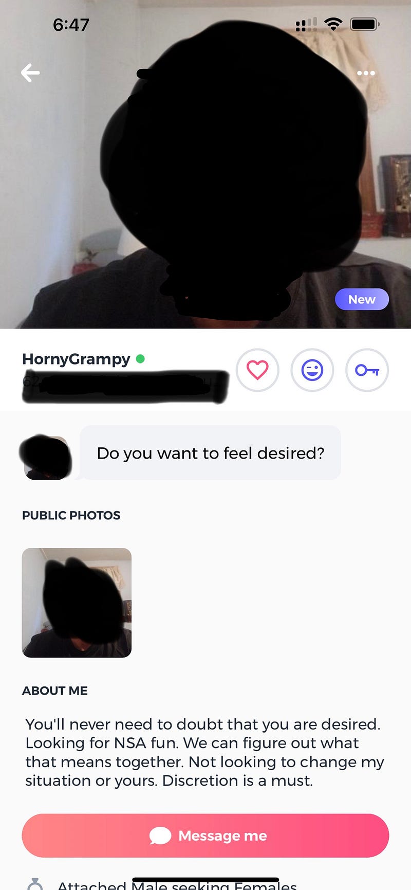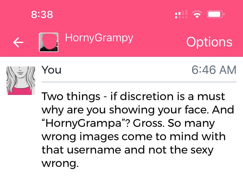 Two things — if discretion is a must why are you showing your face. And “HornyGrampa”? Gross. So many wrong images come to mind with that username and not the sexy wrong.