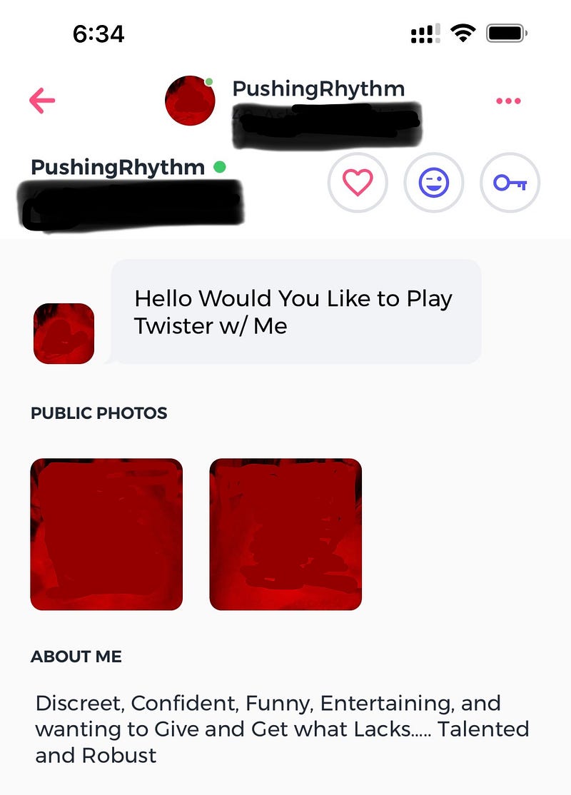 This lothario wants to play a little naked Twister, which I’m sure could be fun, but this sexualized profile comes with a twist.