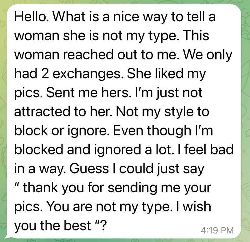 Hello. What is a nice way to tell a woman she is not my type. This woman reached out to me. We only had 2 exchanges. She liked my pics. Sent me hers. I’m just not attracted to her. Not my style to block or ignore. Even though I’m blocked and ignored a lot. I feel bad in a way. Guess I could just say