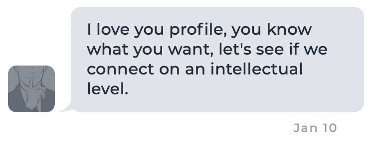 His Message — I love you profile, you know what you want, let’s see if we connect on an intellectual level.