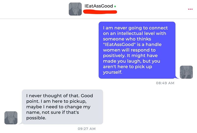 My response — I am never going to connect on an intellectual level with someone who thinks “IEatAssGood” is a handle women will respond to positiviely. It might have made you laugh, but you aren’t here to pick up yourself.