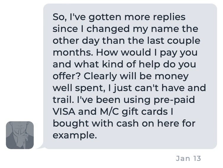 His message after changing his name — So, I’ve gotten more replies since I changed my name the other day than the last couple of months. How would I pay you, and what kind of help do you offer? Clearly will be money well spent, I just can’t have and trail. I’ve been using pre-paid VISA and M/C gift cards I bought with cash on here, for example.
