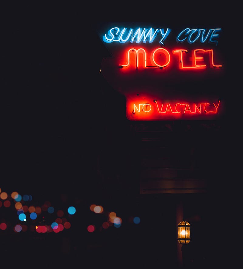 The glowing red beacon in the dusk drew us in. It’s roadside vacancy sign shimmering with desperation called to us. Pulling in, the place was a dump whose best days ended sometime around Disco’s. That’s when the first of the chain hotels moved in down the road.
