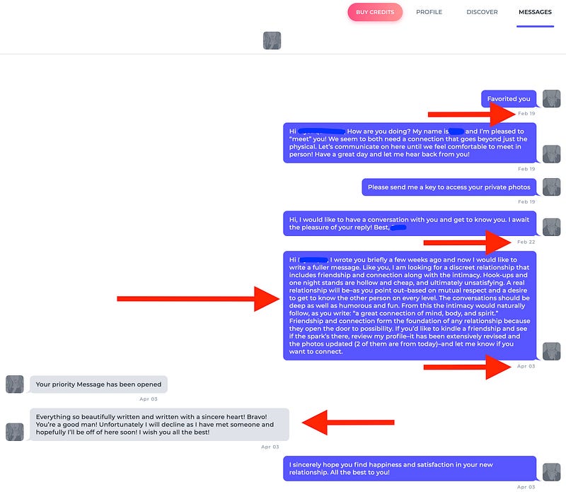 Here is a screenshot of a conversation I had with someone I had written before becoming acquainted with your method. I received no reply, but then I wrote her again after I had revised both my profile and my messaging technique. She wrote me back quite quickly and she liked what I had written, but alas, she had already found someone else. But her response felt good to me anyway.