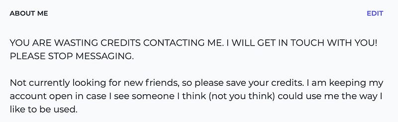 11:02 AM — 🧚🏻♀️ — On this site, and with many dating sites, women only need open a profile to find someone. It’s easy for women to find sex, so they don’t need to put the effort into a profile to attract male attention. The lack of info can act as a screening tool, because they’ll wait and see what the men say. 3/5 will say “hi” or “hello” and that’s it. Doing so takes them out of the race. in general, I tell my clients they are generally only competing with one other male when I support them.