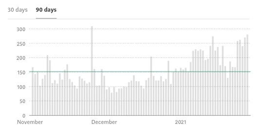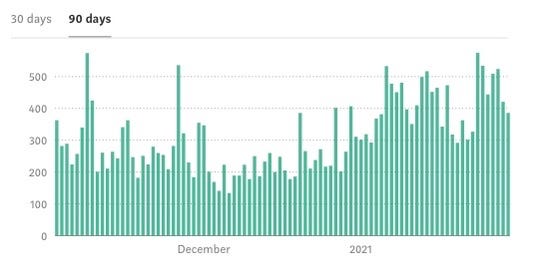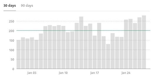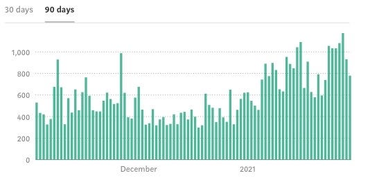 This is what really amazed me. These graphs show our number of unique daily visitors. It was 150/day over the last 90 days, but 200/day in the last 30. That is such an inspiring number of viewers, for what is quite a niche topic. For this, we can’t thank our fans and contributors enough for these numbers!!
