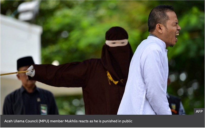 Human rights organizations have demanded to put a stop to these public caning and flogging sentences, and you know what? I’d normally agree, but in Mukhlis’ case? I say whip the shit out of that dumb ass because if anyone should suffer from his stupid law, it should be him.