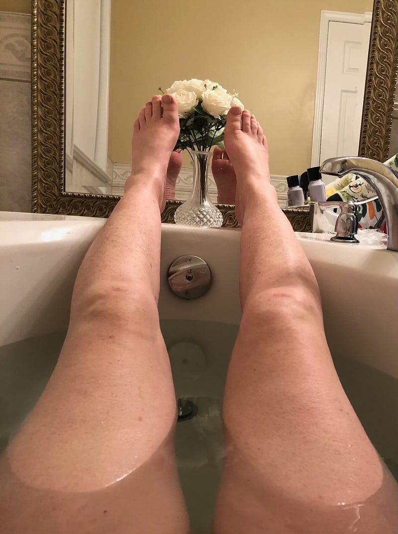 The post-bath warmth, the anticipation, and vibrations all got to me and orgasmed before they arrived. Feeling the stress melt away, I was ready to fall asleep when they knocked at the door.