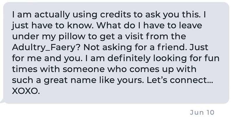 I am actually using credits to ask you this. I just have to know. What do I have to leave under my pillow to get a visit from the Adultry_Faery? Not asking for a friend. Just for me and you. I am definitely looking for fun times with someone who comes up with such a great name like yours. Let’s connect… XOXO.