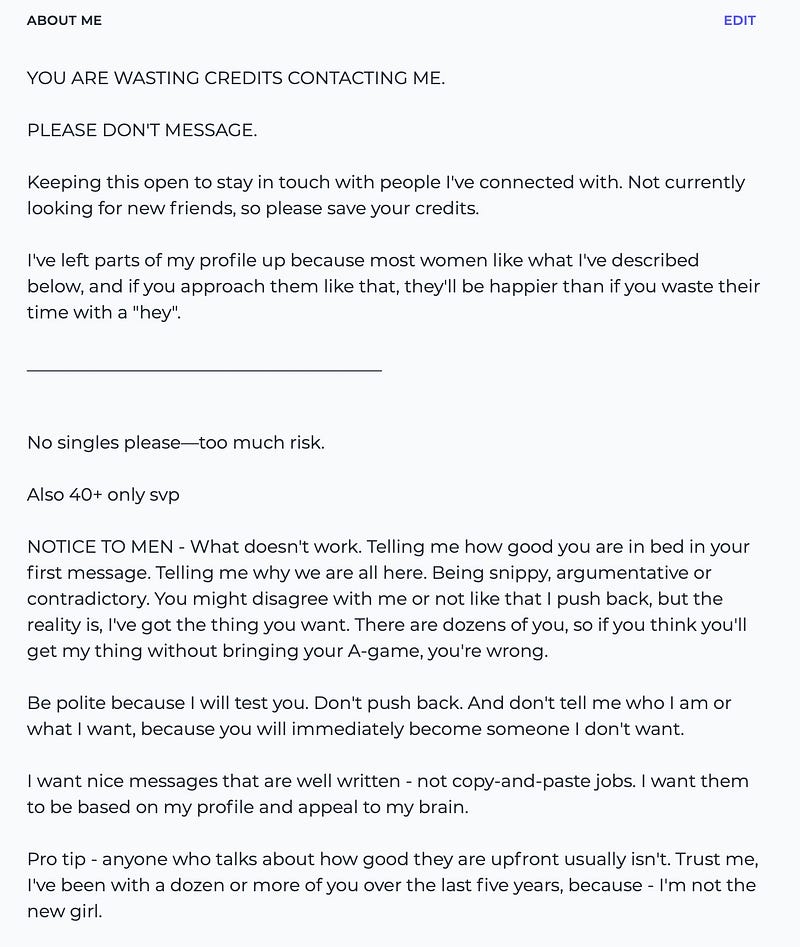 NOTICE TO MEN — What doesn’t work. Telling me how good you are in bed in your first message. Telling me why we are all here. Being snippy, argumentative or contradictory. You might disagree with me or not like that I push back, but the reality is, I’ve got the thing you want. There are dozens of you, so if you think you’ll get my thing without bringing your A-game, you’re wrong.