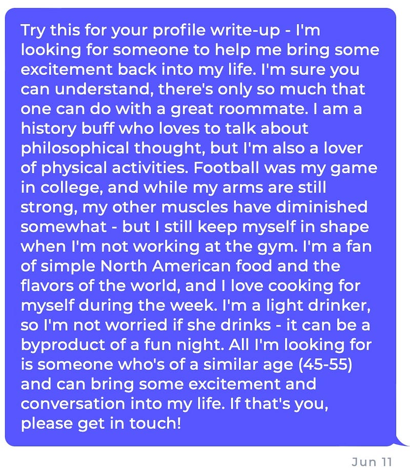 Try this for your profile write-up — I’m looking for someone to help me bring some excitement back into my life. I’m sure you can understand, there’s only so much that one can do with a great roommate. I am a history buff who loves to talk about philosophical thought, but I’m also a lover of physical activities. Football was my game in college, and while my arms are still strong, my other muscles have diminished somewhat — but I still keep myself in shape when I’m not working at the gym. I’m a fan of simple North American food and the flavors of the world, and I love cooking for myself during the week. I’m a light drinker, so I’m not worried if she drinks — it can be a byproduct of a fun night. All I’m looking for is someone who’s of a similar age (45–55) and can bring some excitement and conversation into my life. If that’s you, please get in touch!
