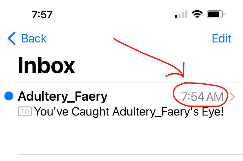 If you recall, my email above arrived at 7:54, so we know from the “Viewed Me” page that it’s only been two minutes, so our favorite Adultery_Faery might still be online. And, so, as above, we’d thank her for checking usout!