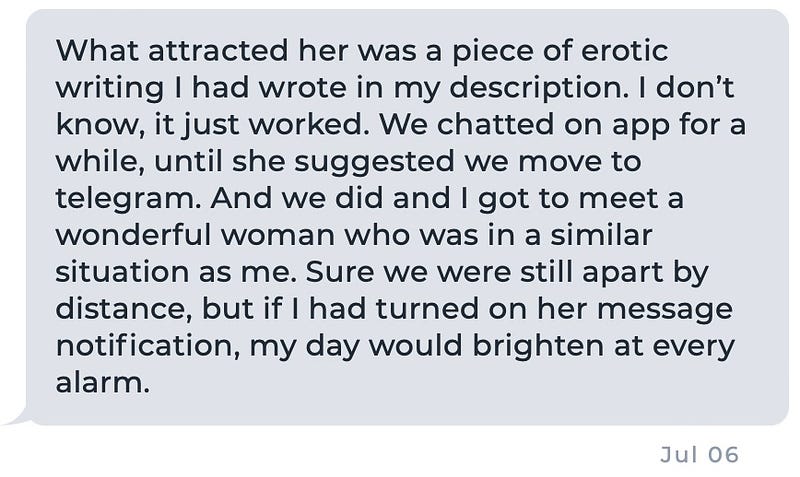His foray into the infamous Ashley Madison, notorious more for its 2015 security breach, brought an unexpected early bond. He’d shared a piece of his soul in the form of erotic writing on his profile that attracted a lady. Their connection was instant, magnetic. “My day would brighten at every alarm,” he confessed, underlining the anticipation their digital encounters sparked.