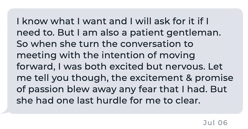Why would she do that? Perhaps to make sure he wouldn’t fall apart after their first meeting. Or she did it to save herself from her own emotional rollercoaster of meeting a nice guy who withdraws after the connection was made. Either way, I think what she did for him was remarkable.