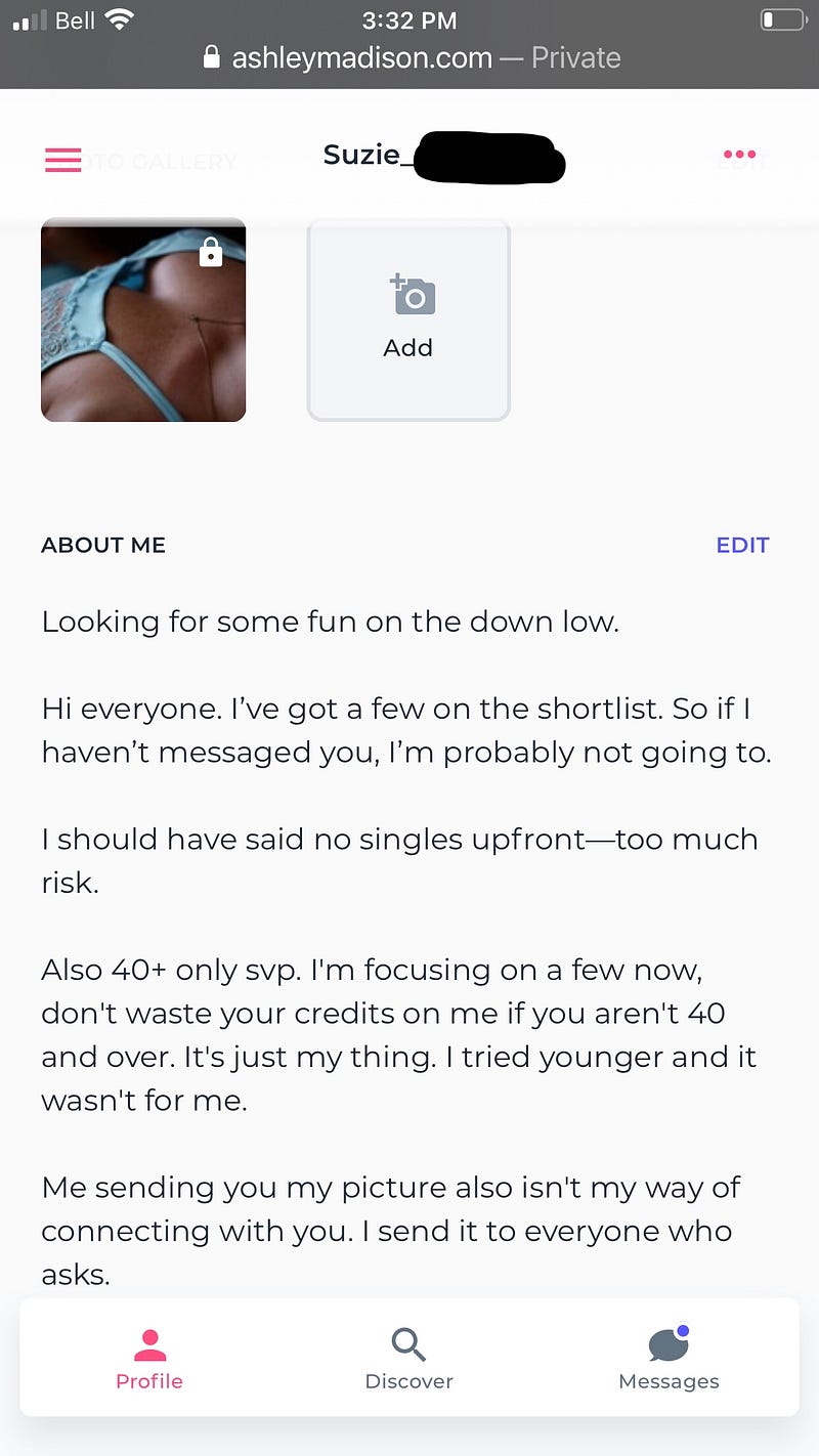 Pro Tip: If your actual name is Joe M, you shouldn’t use it in your profile name. I’m sure, there are other Joe M’s out there, but they aren’t all 54-year-old 5’10” and 230 lbs Aries. Ask yourself — would my spouse recognize this profile name and these details?